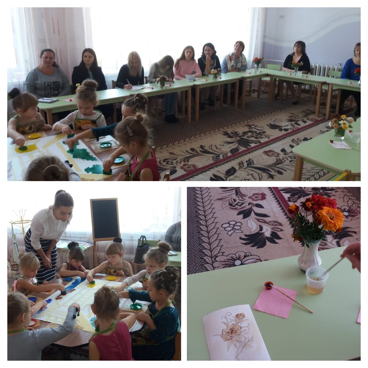 Вихователі садочків подивились заняття гуртка з образотворчого мистецтва у ЗДО «Берізка» на тему «Завітала осінь в наш садочок». Керівник Гуртка Парандій Мар’яна Ігорівна з високим професіоналізмом провела заняття, використовуючи нетрадиційні методики малювання. Системність у роботі Мар’яни Ігорівни показує високі результати діток старшої групи. Дошкільнята вчаться бачити красу, відчувати її, реагувати на красиве емоціями і почуттями. Музичний керівник закладу Федуняк Л.Д. та інструктор з фізичного виховання Дарнобід С.С. доповнили семінар цікавим спортивним таночком та грою на дитячих музичних інструментах.